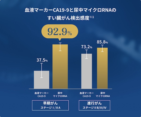 尿中マイクロRNA検査は、発見が難しいとされる早期のすい臓がん(ステージI/IIA)において、感度92.9%という優れた結果を示しています。これは、従来の腫瘍マーカー(CA19-9)の感度37.5%と比較しても優れた検出性能です。