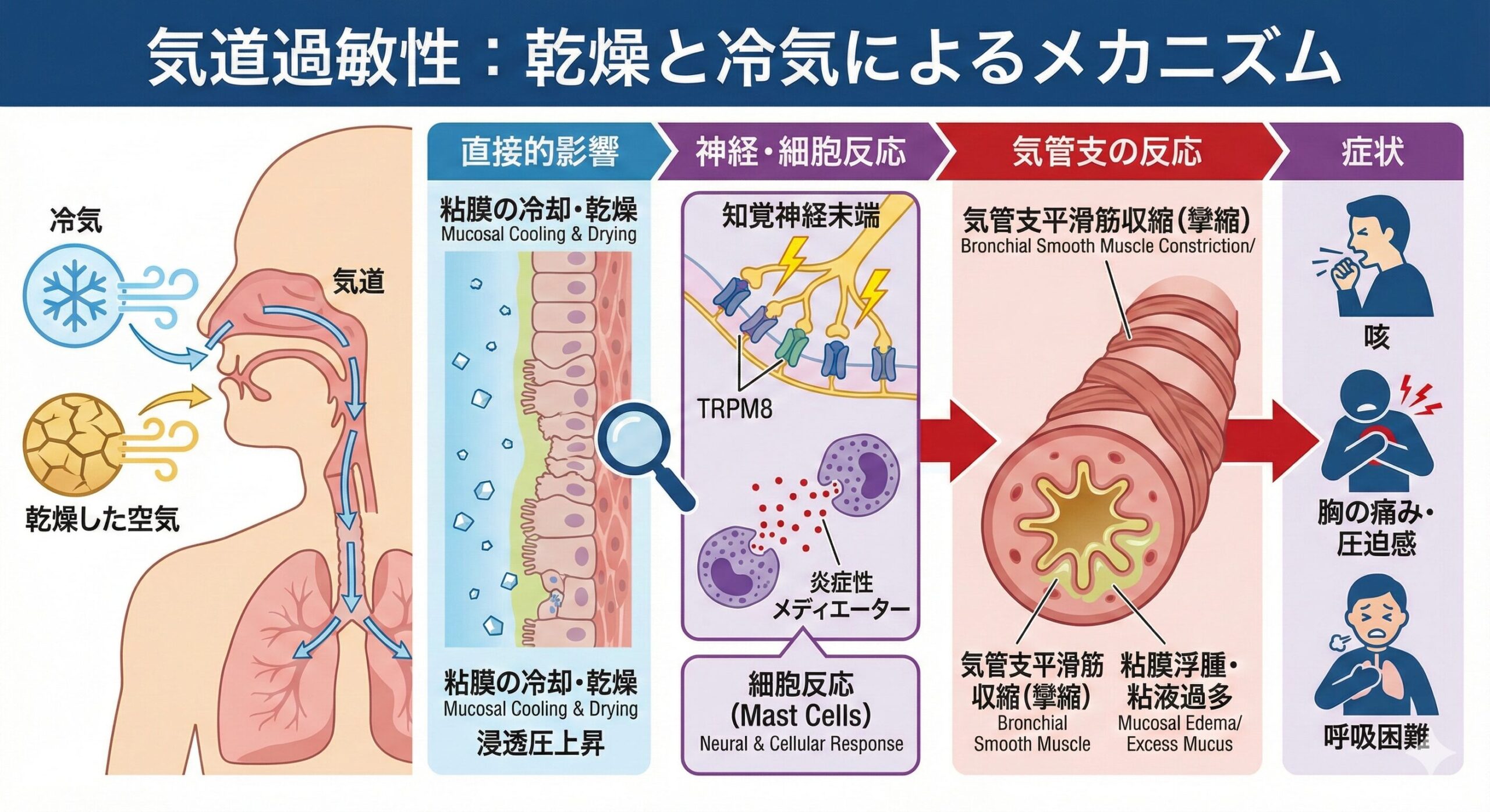 これは、乾燥した冷たい空気が刺激となり、気管支がキュッと収縮(攣縮)してしまうために起こります。