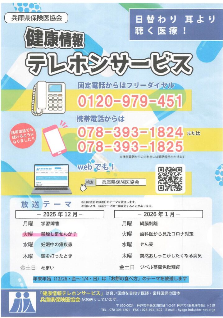 兵庫県保険医協会の「健康情報テレホンサービス」にて、当院の院長が執筆したテーマが放送されます。